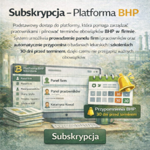 Podstawowy dostęp do Platformy Subskrybenta BHP, która pomaga zarządzać pracownikami oraz pilnować ważnych terminów związanych z bezpieczeństwem pracy.